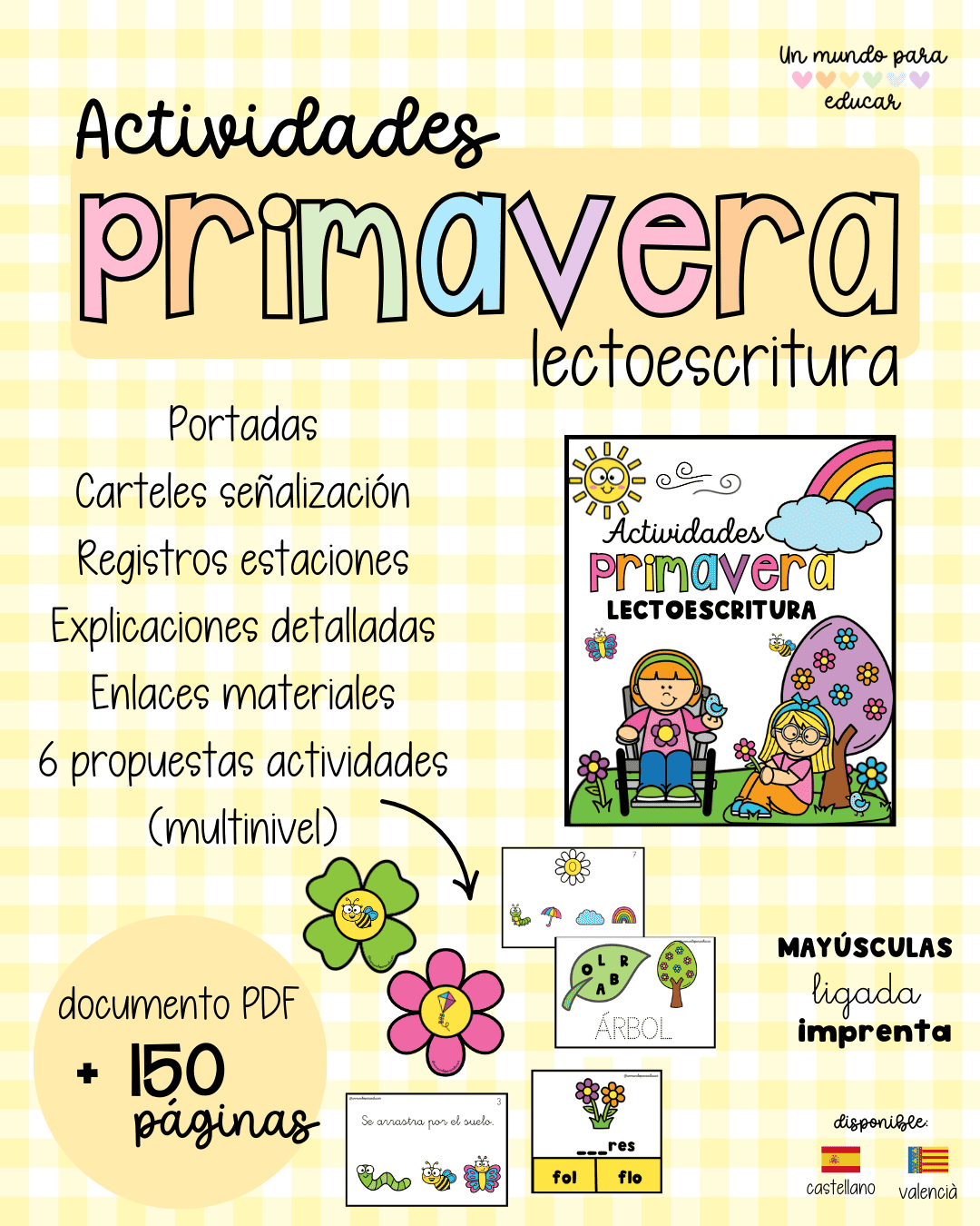 6 propuestas para trabajar la lectoescritura de manera creativa y divertida, con portadas, enlaces a materiales, carteles de señalización y registros prácticos. Disponible en Castellano.